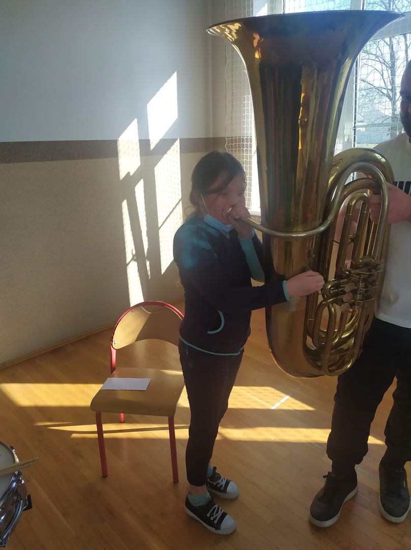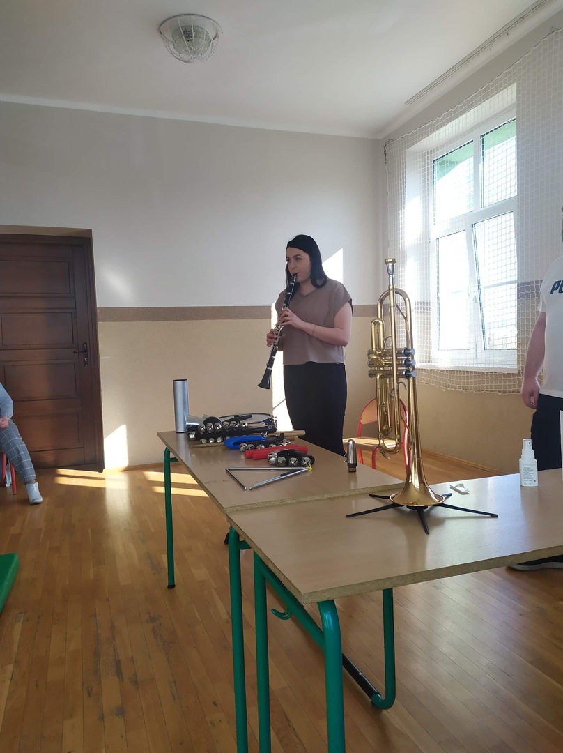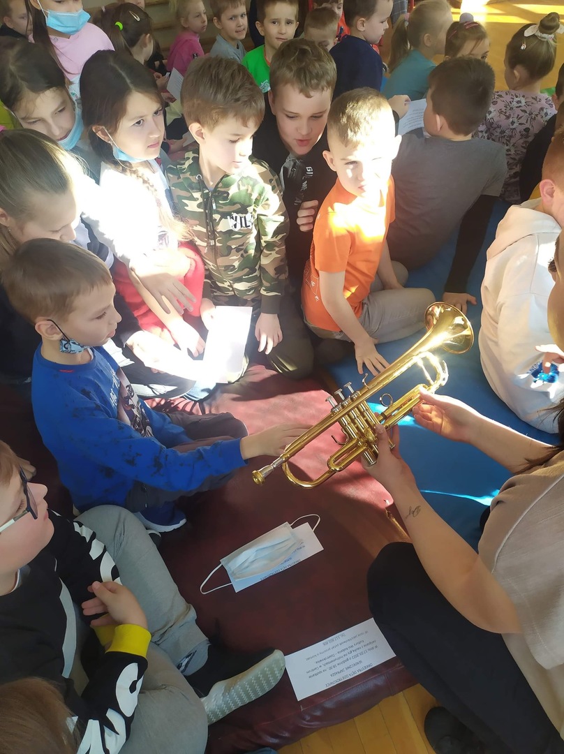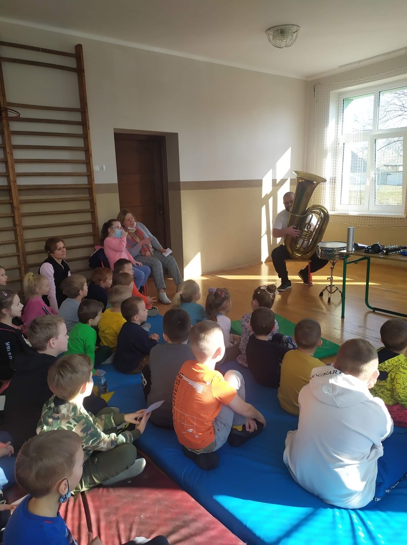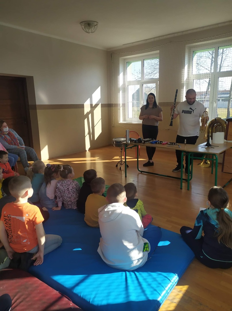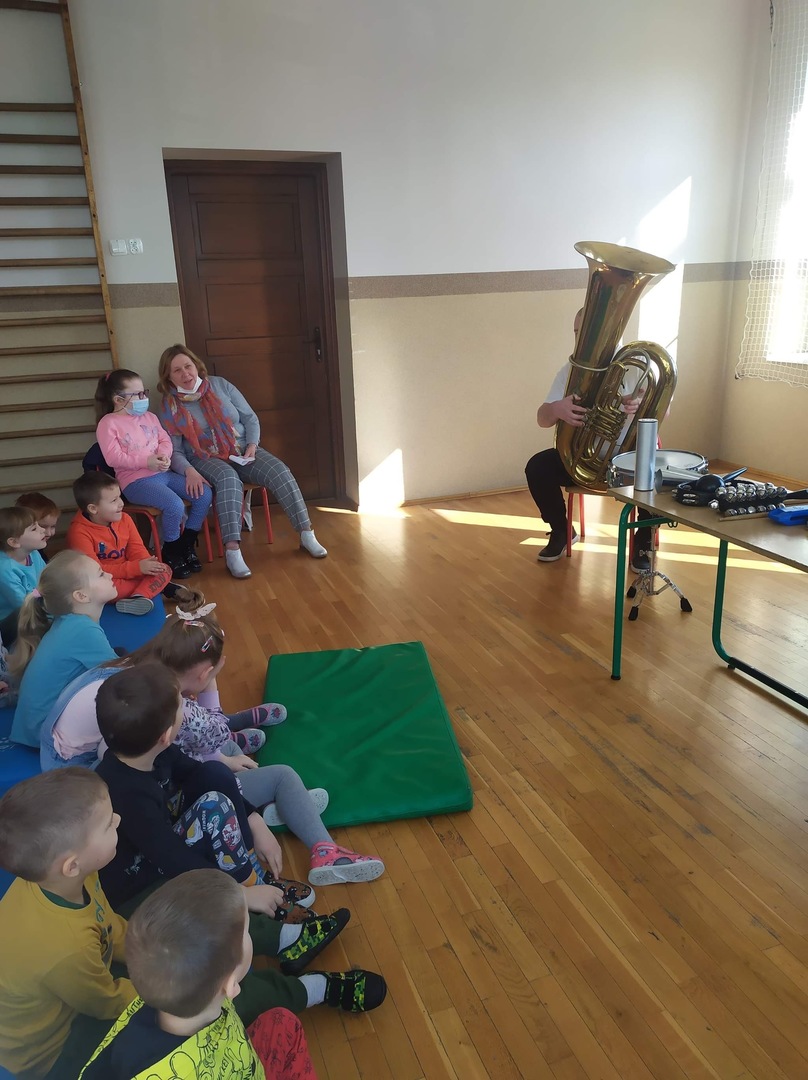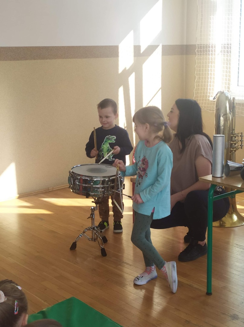 Zaproszeni goście – pan Michał Maluszczak i p. Zuzanna Kubak wykonali kilka utworów i zaprezentowali po kolei swoje instrumenty. Chętne dzieci mogły spróbować gry na tubie, klarnecie, trąbce, tamburynie, bębenku, trójkącie, pudełku akustycznym i wielu innych. Następnie dzieci sprawdzały czy potrafią jednocześnie grać na instrumentach i maszerować za dyrygentem, tak jak to robią muzycy orkiestry. Egzamin wypadł bardzo dobrze!