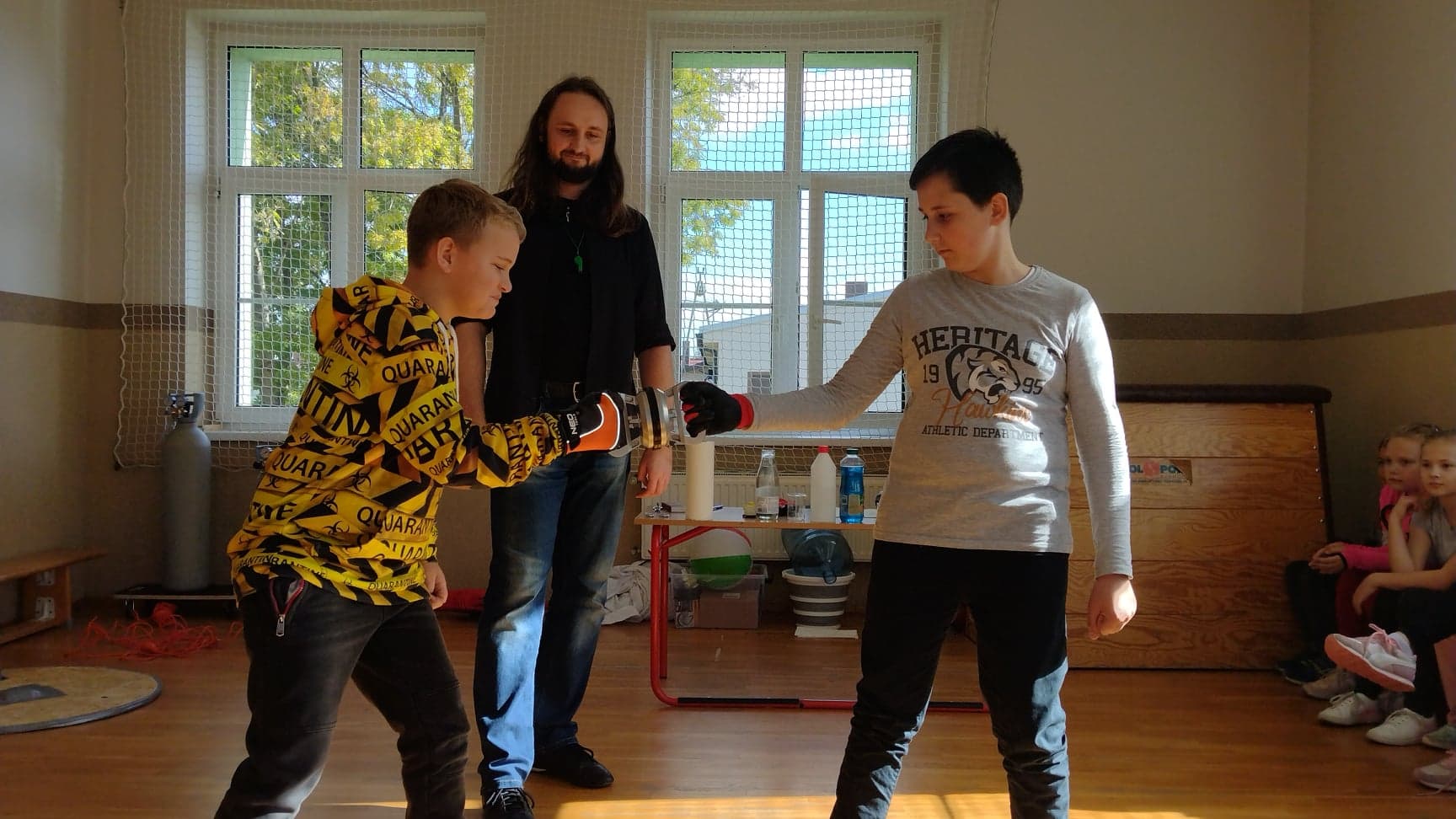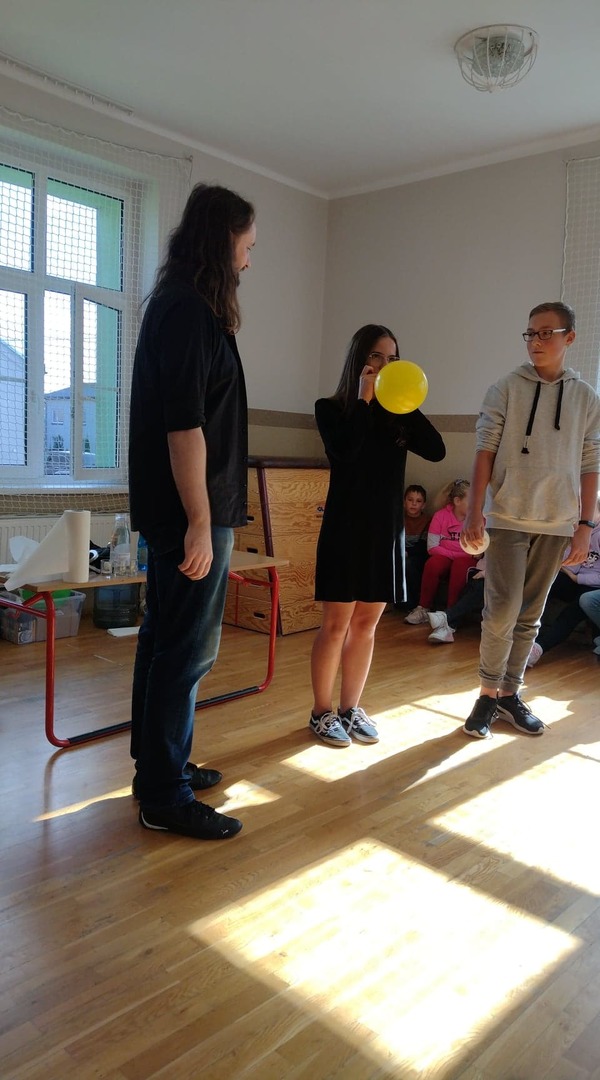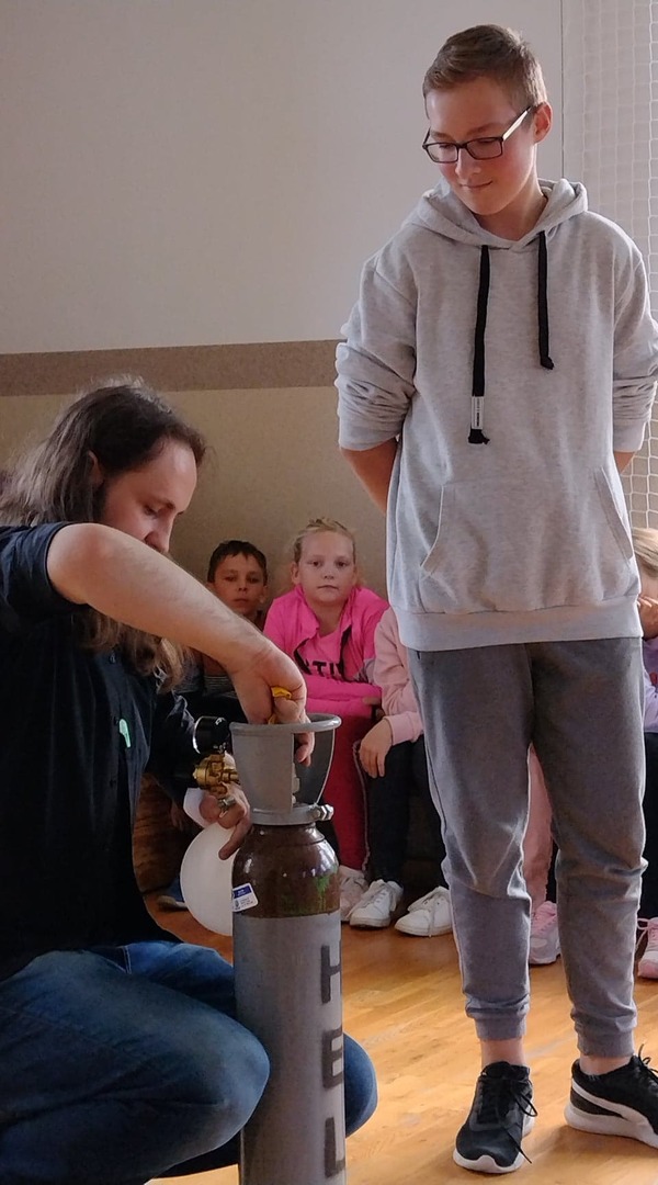 W dniu 11.10.2022 r. w naszej szkole odbyła się nietypowa lekcja przyrody. Uczniowie w praktyczny sposób dowiedzieli się między innymi jak stworzyć własny poduszkowiec, czym jest „duch w butelce”, w jaki sposób działa hel. Poznali również zasady bezpiecznego przeprowadzania eksperymentów. Uczniowie bardzo chętnie angażowali się w zajęciach. Lekcja wszystkim się podobała.