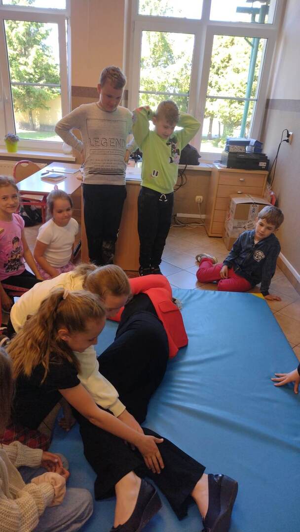 alarmowych oraz sposobu powiadamiania służb ratowniczych.Pani Żaneta uświadomiła uczniów, żeudzielanie pierwszej pomocy jest naszym obowiązkiem. Wiele emocji wzbudziło praktyczne przypomnienie czynności z zakresu resuscytacji krążeniowo - oddechowej. Wspólnie z Panią Żanetą uczniowie przypomnieli sobie również ważne numery alarmowe.Była to niezwykła lekcja – połączenie zabawy z przekazywaniem jakże istotnej wiedzy, która może przynieść nieocenionyefekt – ratowanie życia.