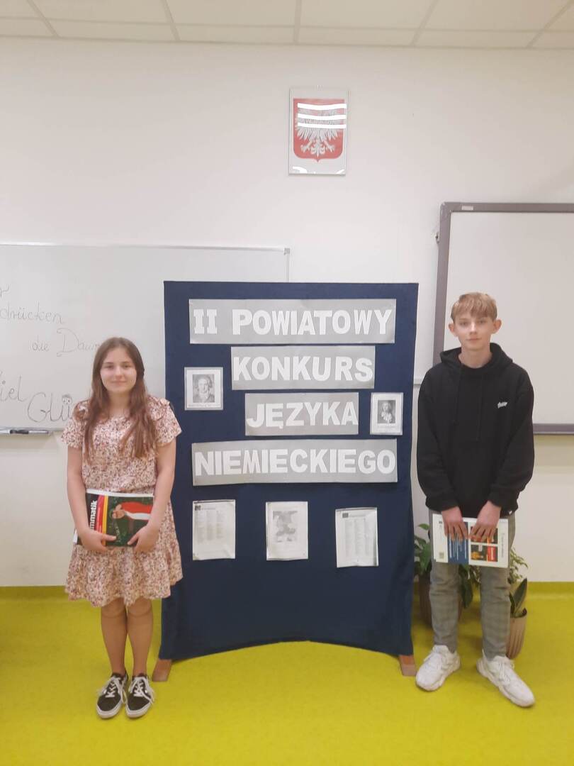 Uczniowie naszej szkoły Emilia Jóźwin kl. VII oraz Hubert Strzelczyk kl. VIII brali udział w drugim powiatowym konkursie języka niemieckiego, który odbył się 05.06.2023r w Zespole Szkół Ponadpodstawowych im. Stanisława Staszica w Wieruszowie. Uczniowie zmierzyli się z częscią pisemną w formie godzinnego testu, a następnie podeszli indywidualnie do części ustnej konkursu. Udział w konkursie był dużym wyzwaniem i doświadczeniam.