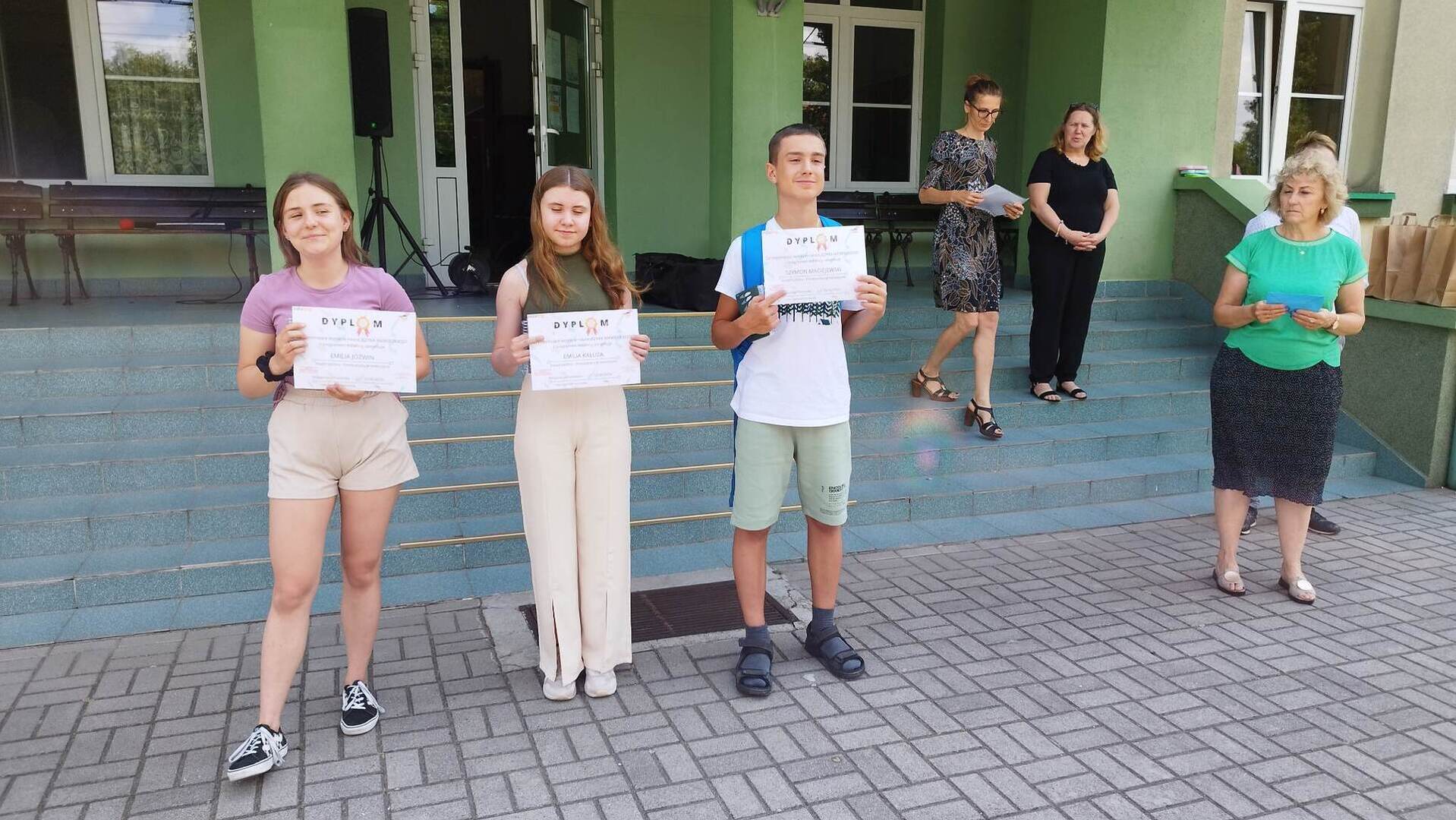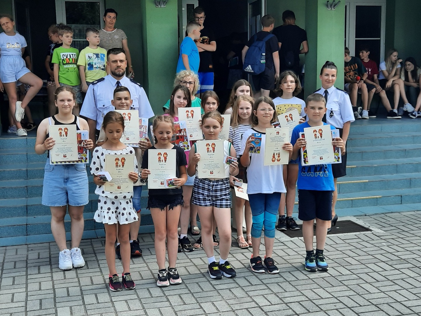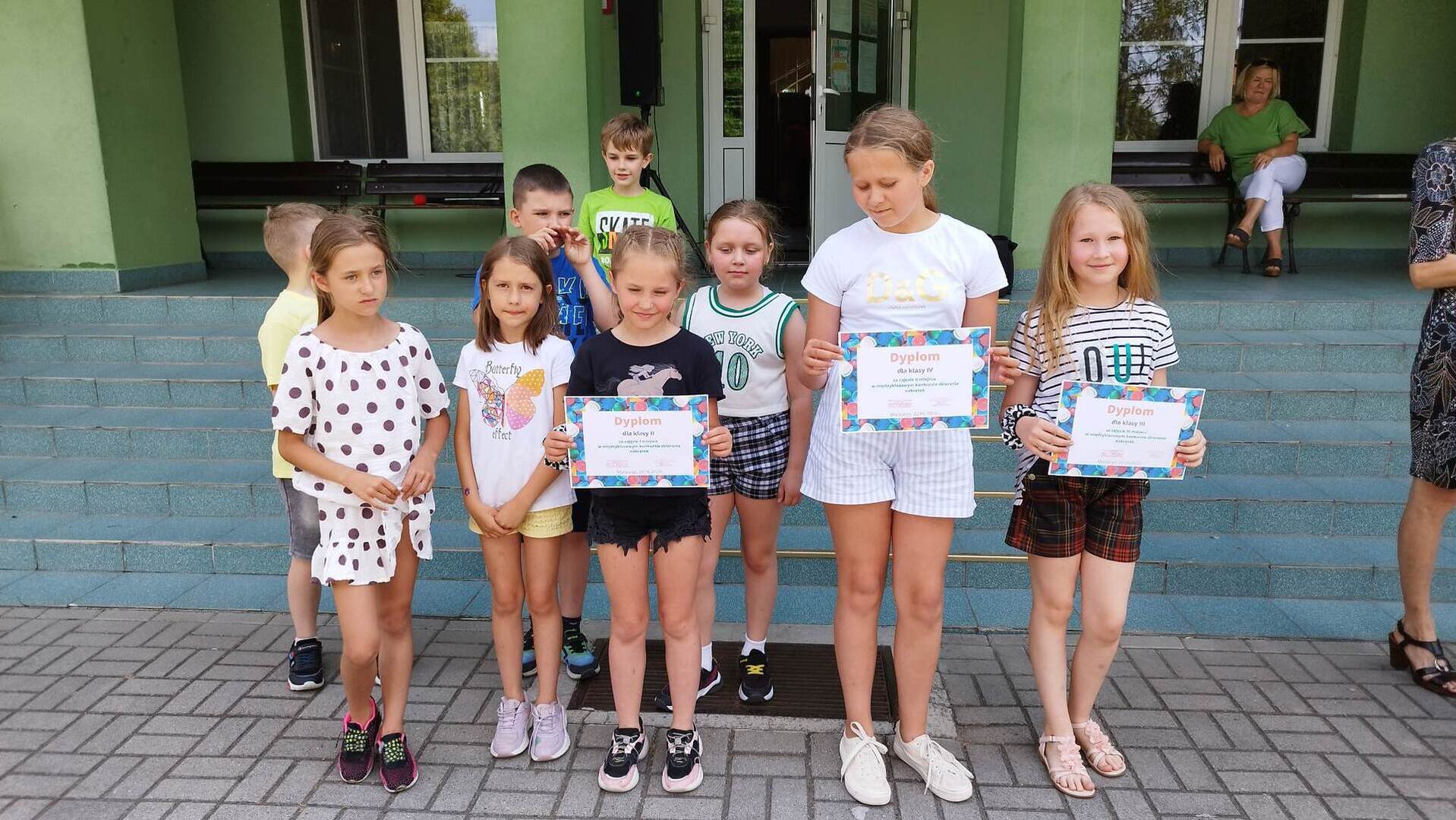 W czwartek 22.06.2023r na krótkim apelu zostały podsumowane szkolne konkursy. Nagrody otrzymali uczniowie którzy najwięcej przynieśli makulatury, baterii lub puszek. W szkolnym konkursie międzyklasowym zbierania nakrętek wyłoniono trzy pierwsze miejsca. Najwięcej nakrętek zebrała klasa II (61,20 kg), następnie klasa IV (34,2kg) oraz klasa III (28,9 kg). Klasy te w nagrodę otrzymały Pizzę. Łącznie w szkole zebrano 171,60 kg nakrętek. Nagrodzeni zostali również uczniowie laureaci konkursu z SKO oraz uczniowie którzy cały rok pracowali w programie Instaling ucząc się niemieckich słówek. Na zakończenie nagrody otrzymali wszyscy uczniowie oraz [przedszkolaki którzy brali udział w konkursie plastycznym organizowanym przrez Ochotniczą Straż Pożarną.