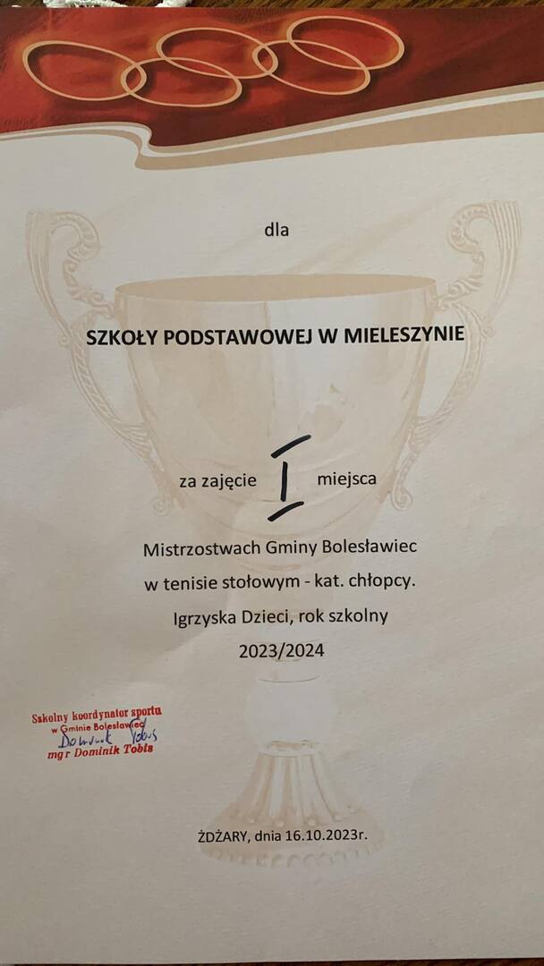 Uczniowie naszej szkoły: Marcin Mączka oraz Łukasz Maciejewski reprezentowali naszą szkołę na zawodach gminnych w tenisa stołowego w Żdżarach. Uczniowie grupowo wywalczyli pierwsze miejsce.