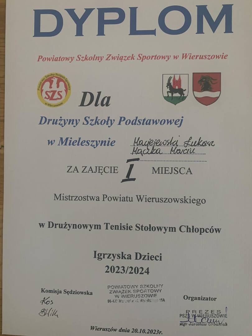 Uczniowie naszej szkoły: Marcin Mączka oraz Łukasz Maciejewski uczestniczyli w drużynowych Mistrzostwach Powiatu Wieruszowskiego w tenisie stołowym chłopców w Wieruszowie. Po sukcesie na etapie gminnym zaprezentowali wysoki poziom gry na zawodach powiatowych gdzie zdobyli pierwsze miejsce zdobywając awans do półfinałów wojewódzkich, które odbędą się 15 listopada w Zduńskiej Woli.