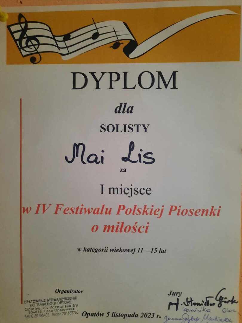 Uczennica naszej szkoły Maja Lis uczestniczyła w niedzielę tj. 5 listopada w IV Festiwalu Polskiej Piosenki o miłości organizowanym przez Opatowskie Stowarzyszenie Kulturalno – Sportowe. To już kolejny występ Mai w tym konkursie. Majka zdobyła pierwsze miejsce w kategorii wiekowej 11-15 lat. Zaśpiewała piosenkę Zbigniewa Wodeckiego „Nauczmy się żyć obok siebie…”