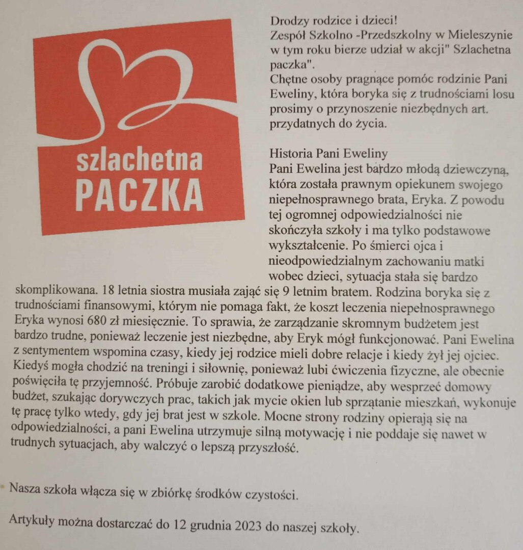 Zespół Szkolno - Przedszkolny w Mieleszynie w tym roku bierze udział w akcji "Szlachetna Paczka".