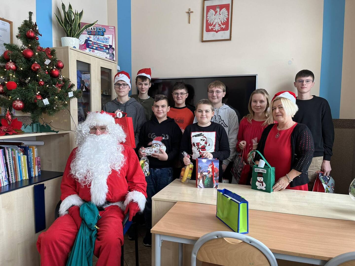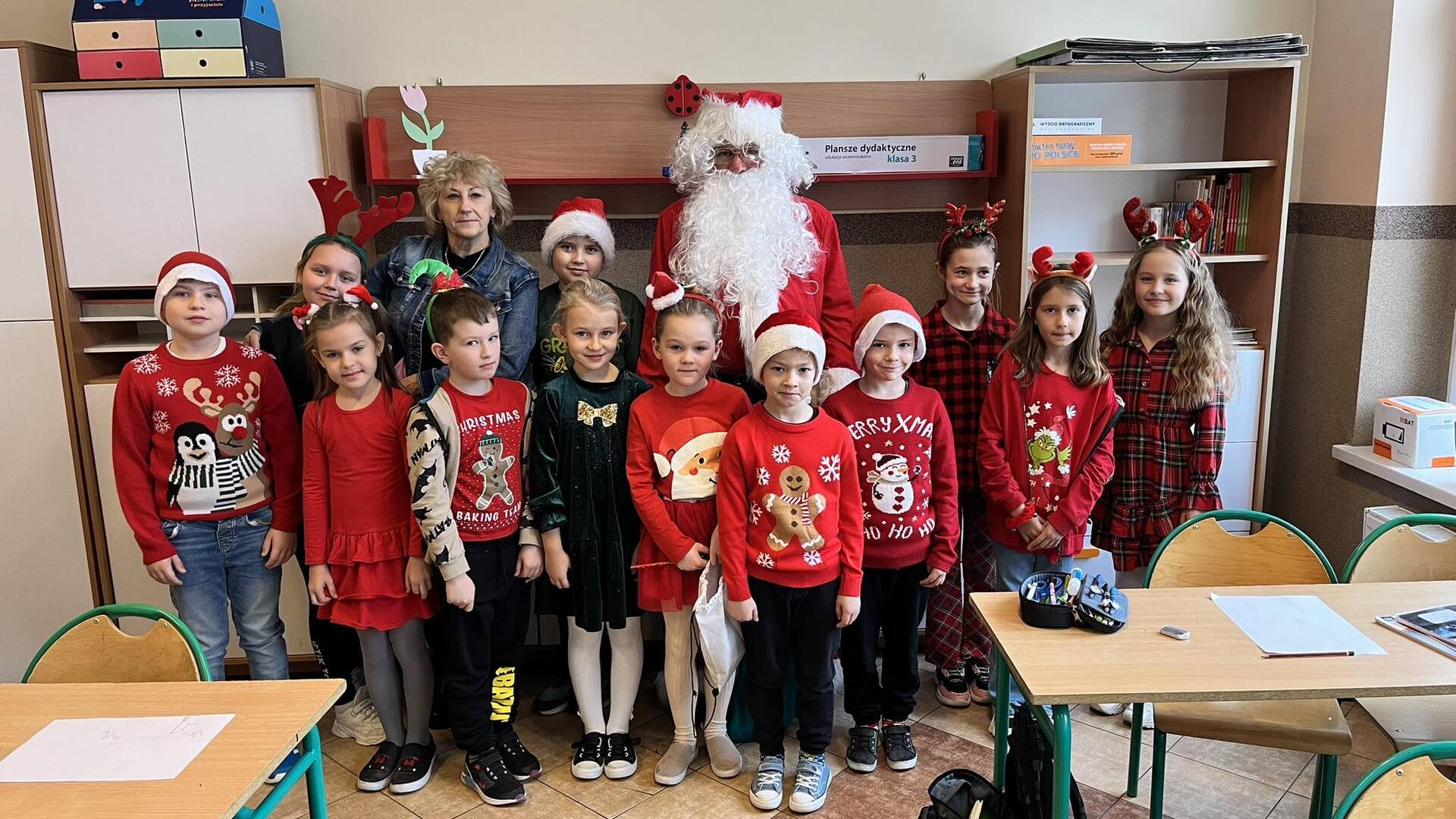 Mikołajki w naszej szkole już na stałe wpisały się w kalendarz wydarzeń. W tym roku również nie zabrakło radości i uśmiechów. Uczniowie ubrani byli dziś w stroje z akcentem mikołajkowym. Był również Święty Mikołaj i Pani Mikołajowa, którzy rozdawali prezenty, przygotowane przez Radę Rodziców.