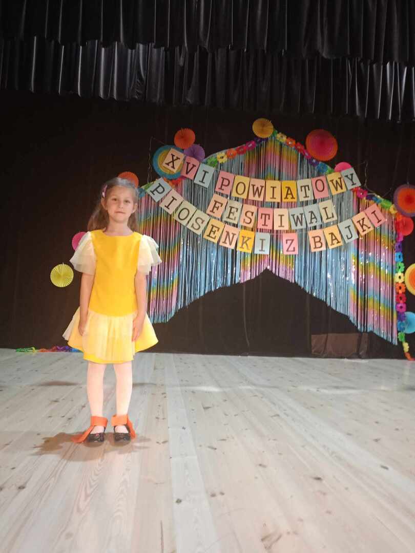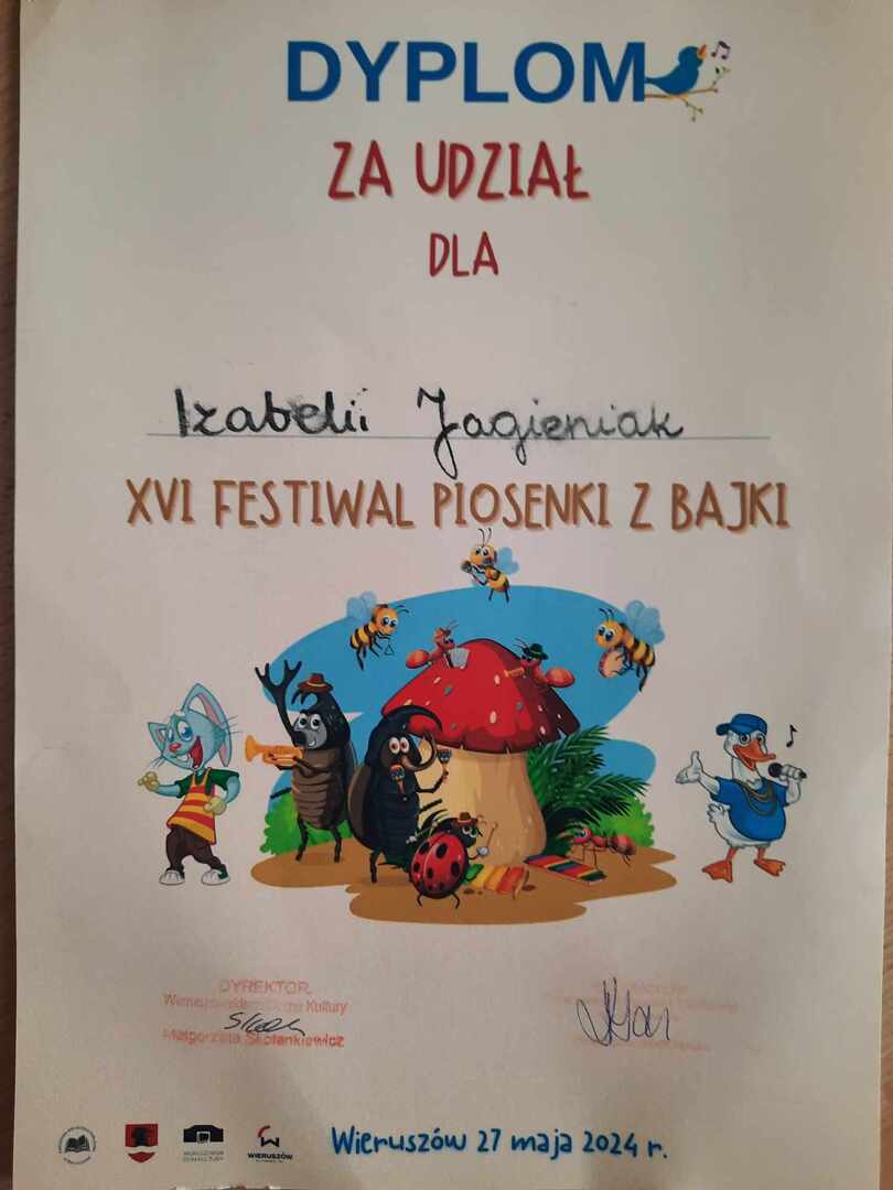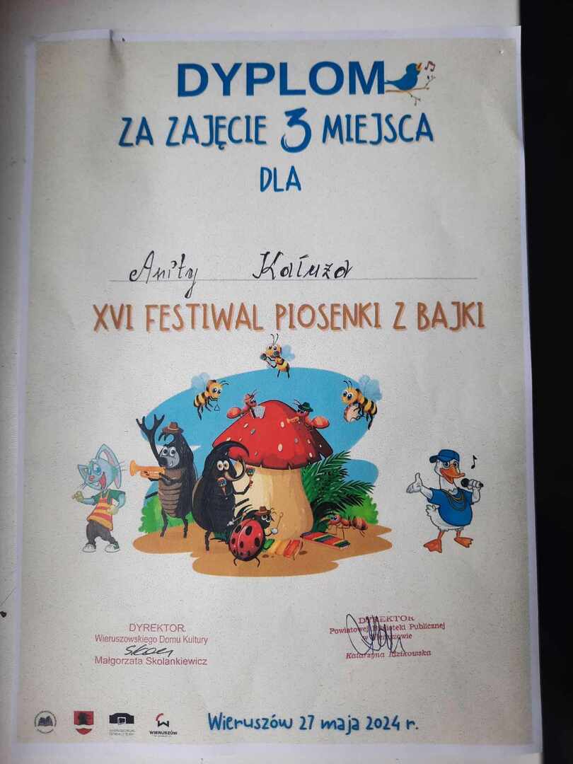 Uczniowie naszej szkoły Anita Kałuża z klasy 3., Tomasz Lis z klasy 1. oraz Izabela Jagieniak z przedszkola reprezentowali naszą szkołę w XVI Festiwalu Piosenki z Bajki organizowanym przez Wieruszowski Dom Kultury w Wieruszowie, który odbył się 27 maja 2024roku.